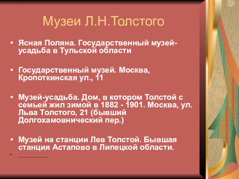 Слайд 21Музеи Л.Н.Толстого