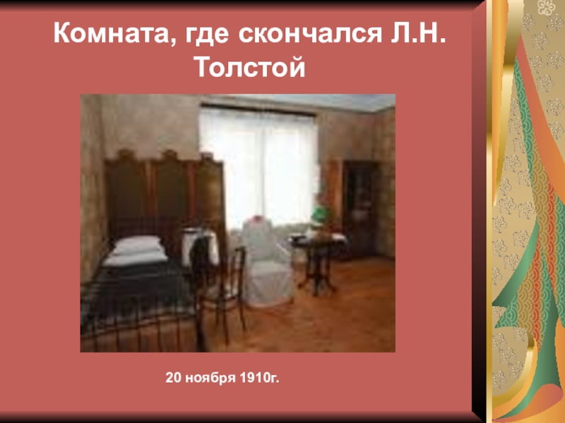 Слайд 13Комната, где скончался Л.Н.Толстой