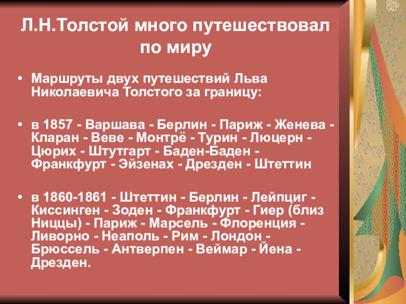 Слайд 7Л.Н.Толстой много путешествовал по миру