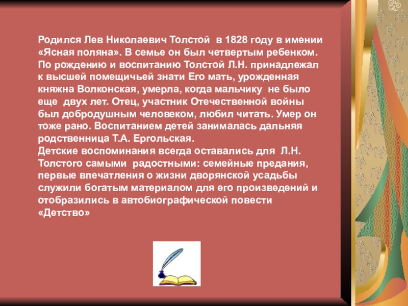 Детские воспоминания всегда оставались для Л.Н.Толстого самыми радостными: семейные предания, первые впечатления о жизни дворянской усадьбы служили богатым материалом для его произведений и отобразились в автобиографической повести «Детство»