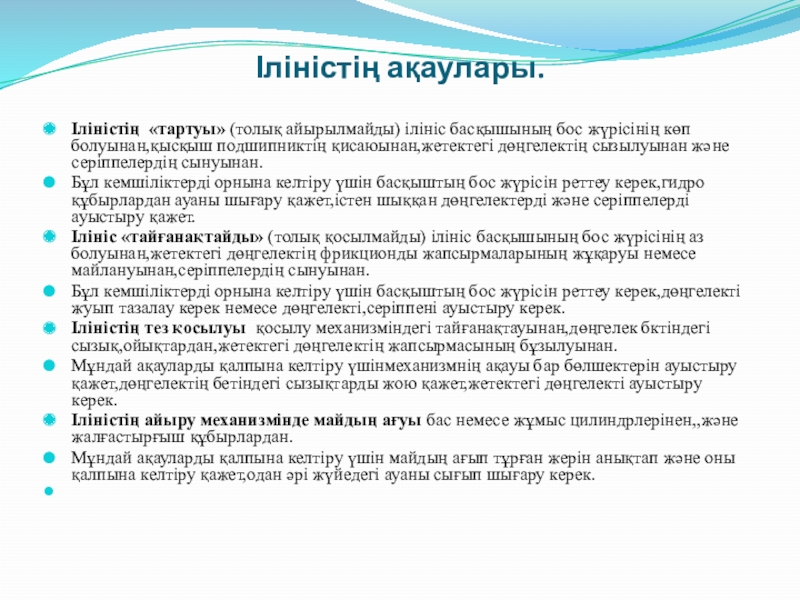 Ілініс «тайғанақтайды» (толық қосылмайды) ілініс басқышының бос жүрісінің аз болуынан,жетектегі дөңгелектің фрикционды жапсырмаларының жұқаруы немесе майлануынан,серіппелердің сынуынан.