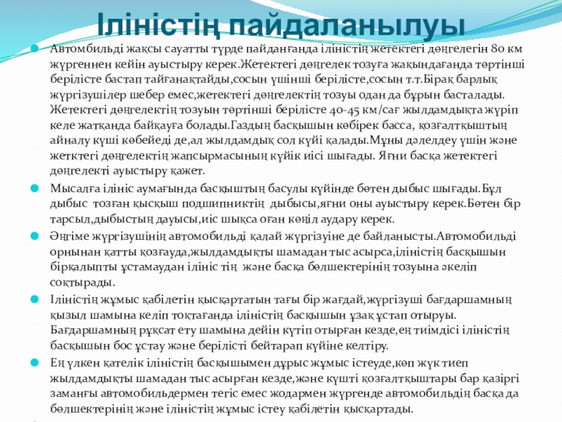Автомбильді жақсы сауатты түрде пайданғанда іліністің жетектегі дөңгелегін 80 км
