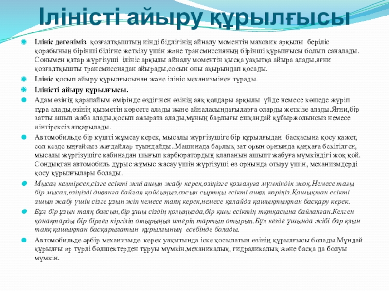Автомобильде әрбір механизмде керек уақытында іске қосылатын өзінің құрылғысы болады.Мұндай құрылғы әр түрлі бөлшектерден тұруы мүмкін,механикалық, гидраликалық және басқа да болуы мүмкін.