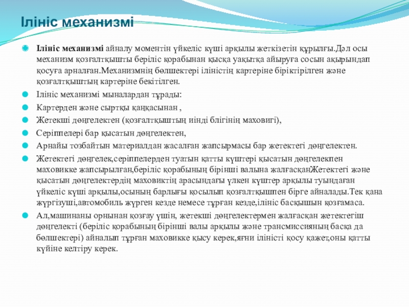 Ал,машинаны орнынан қозғау үшін, жетекші дөңгелектермен жалғасқан жетектегіш дөңгелекті (беріліс қорабының бірінші валы арқылы және трансмиссияның басқа да бөлшектері) айналып тұрған маховикке қысу керек,яғни іліністі қосу қажет,оны қатты күйіне келтіру керек.