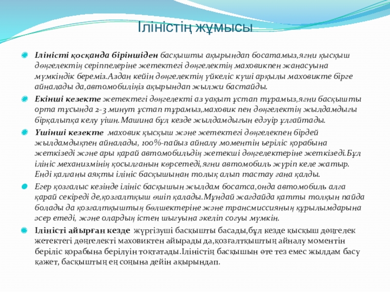 Іліністі қосқанда біріншіден басқышты ақырындап босатамыз,яғни қысқыш дөңгелектің серіппелеріне жетектегі