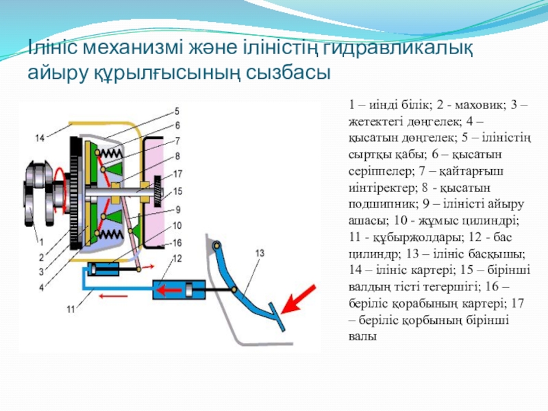 2 - маховик; 3 – жетектегі дөңгелек; 4 – қысатын дөңгелек; 5 – іліністің сыртқы қабы; 6 – қысатын серіппелер; 7 – қайтарғыш иінтіректер; 8 - қысатын подшипник; 9 – іліністі айыру ашасы; 10 - жұмыс цилиндрі; 11 - құбыржолдары; 12 - бас цилиндр; 13 – ілініс басқышы; 14 – ілініс картері; 15 – бірінші валдың тісті тегершігі; 16 – беріліс қорабының картері; 17 – беріліс қорбының бірінші валы