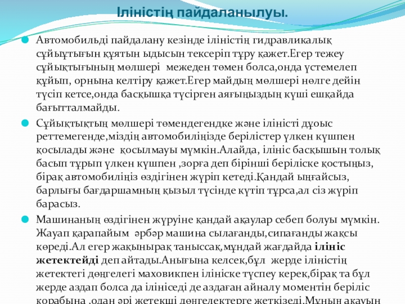 Автомобильді пайдалану кезінде іліністің гидравликалық сұйыұтығын құятын ыдысын тексеріп тұру