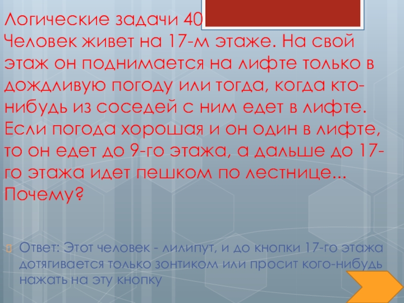 Ответ: Этот человек - лилипут, и до кнопки 17-го этажа дотягивается только зонтиком или просит кого-нибудь нажать на эту кнопку