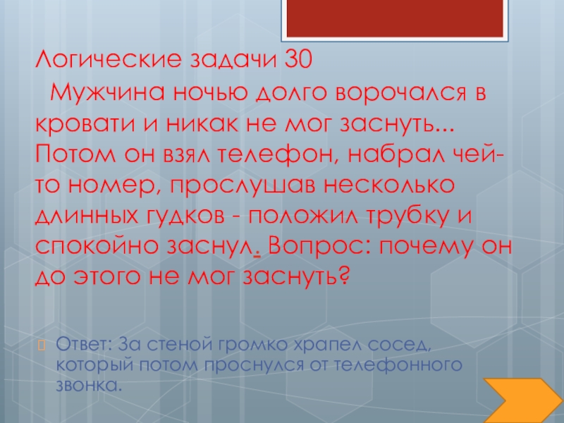 Ответ: За стеной громко храпел сосед, который потом проснулся от телефонного звонка.