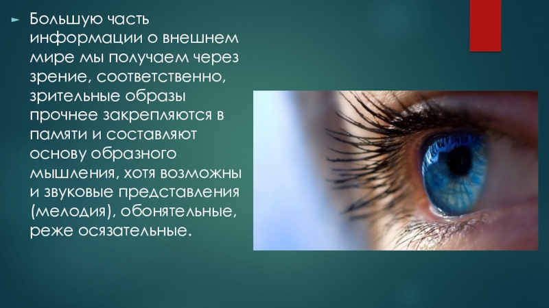 Слайд 20Большую часть информации о внешнем мире мы получаем через зрение, соответственно,