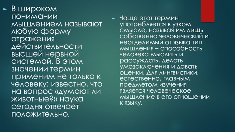 Чаще этот термин употребляется в узком смысле, называя им лишь собственно человеческий и неотделимый от языка тип мышления – способность человека мыслить и рассуждать, делать умозаключения и давать оценки. Для лингвистики, естественно, главным предметом изучения является человеческое мышление в его отношении к языку.