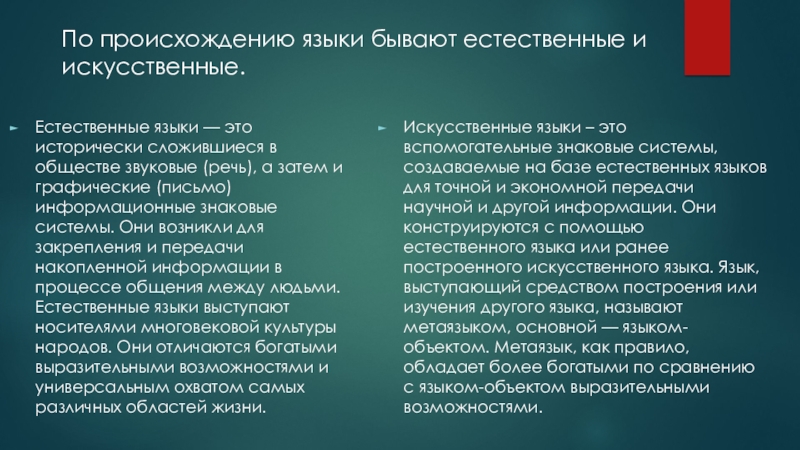 По происхождению языки бывают естественные и искусственные.