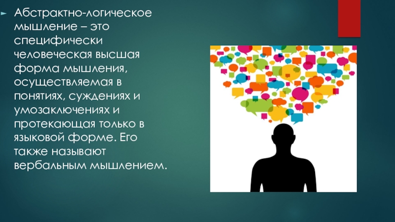 Слайд 21Абстрактно-логическое мышление – это специфически человеческая высшая форма мышления, осуществляемая в