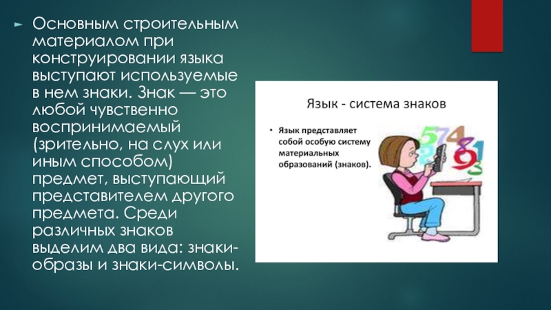 Слайд 6Основным строительным материалом при конструировании языка выступают используемые в нем знаки.