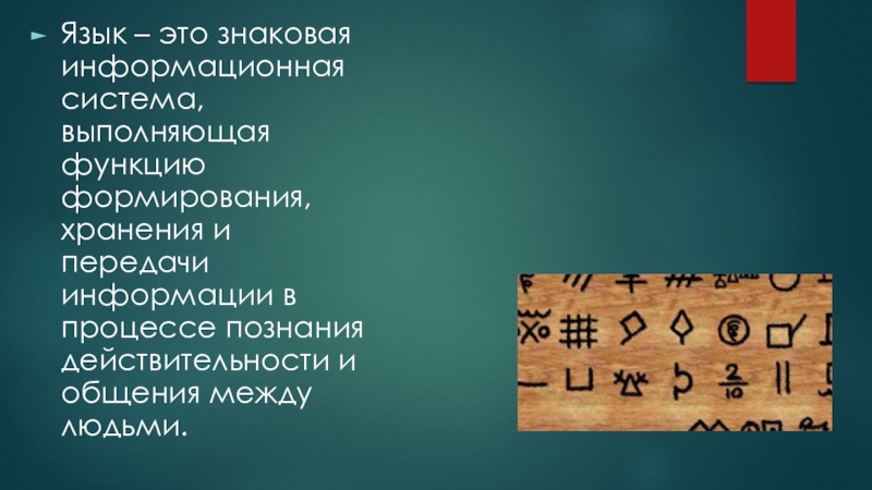 Слайд 5Язык – это знаковая информационная система, выполняющая функцию формирования, хранения и