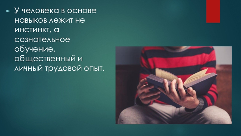 Слайд 18У человека в основе навыков лежит не инстинкт, а сознательное обучение,