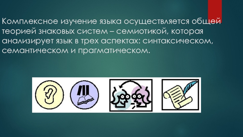 Слайд 7Комплексное изучение языка осуществляется общей теорией знаковых систем – семиотикой, которая