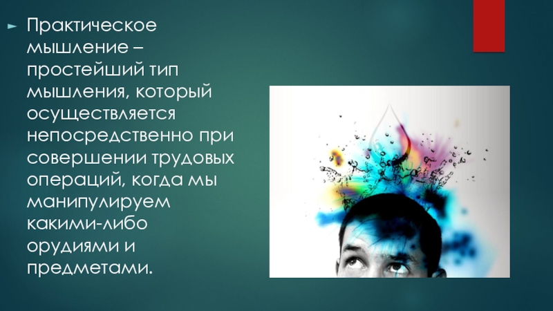 Слайд 16Практическое мышление – простейший тип мышления, который осуществляется непосредственно при совершении