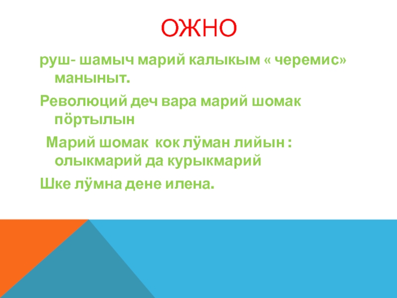 Ожноруш- шамыч марий калыкым « черемис» маныныт.Революций деч вара марий шомак пöртылын Марий шомак кок лÿман лийын