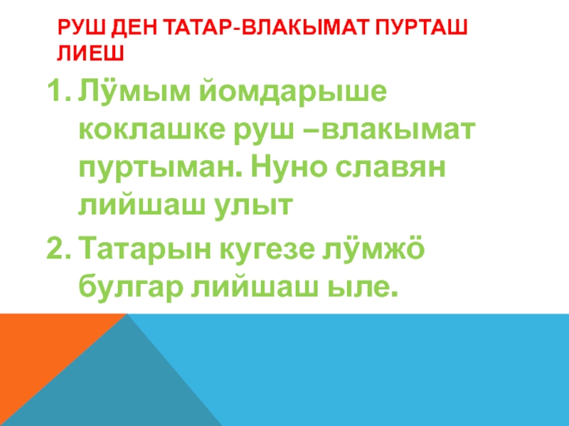 Слайд 5Руш ден татар-влакымат пурташ лиеш