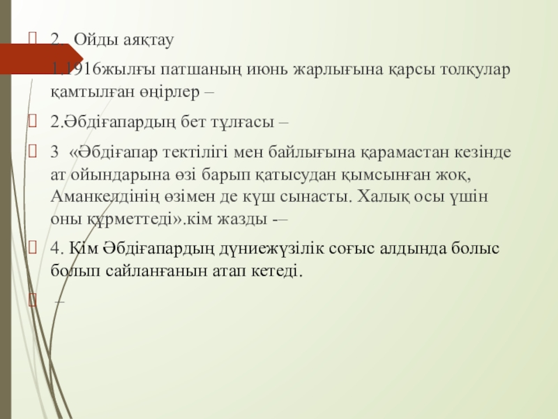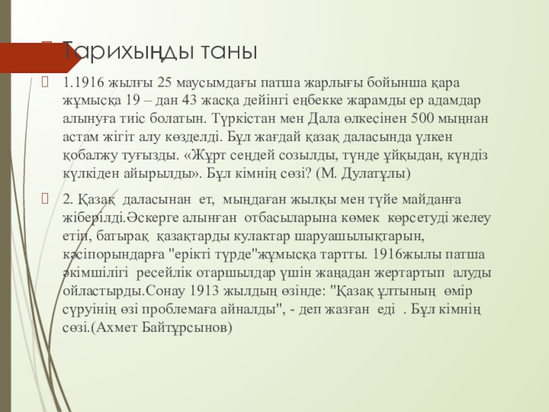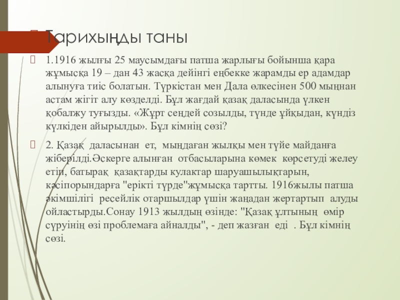 2. Қазақ даласынан ет, мыңдаған жылқы мен түйе майданға жіберілді.Әскерге алынған отбасыларына көмек көрсетуді желеу етіп, батырақ қазақтарды кулактар шаруашылықтарын, кәсіпорындарға "ерікті түрде"жұмысқа тартты. 1916жылы патша әкімшілігі ресейлік отаршылдар үшін жаңадан жертартып алуды ойластырды.Сонау 1913 жылдың өзінде: "Қазақ ұлтының өмір сүруінің өзі проблемаға айналды", - деп жазған еді . Бұл кімнің сөзі.