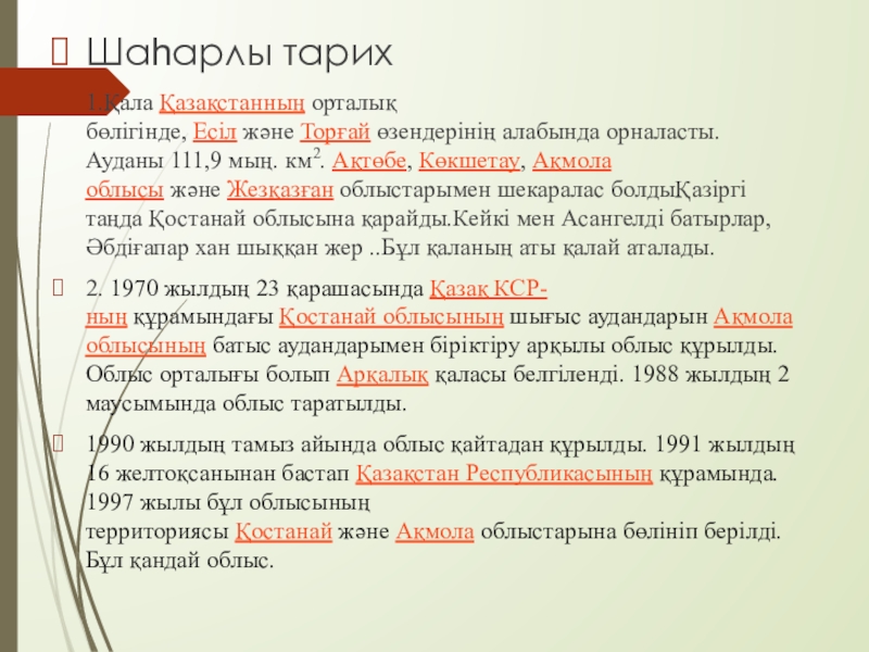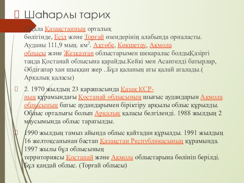2. 1970 жылдың 23 қарашасында Қазақ КСР-ның құрамындағы Қостанай облысының шығыс аудандарын Ақмола облысының батыс аудандарымен біріктіру арқылы облыс құрылды. Облыс орталығы болып Арқалық қаласы белгіленді. 1988 жылдың 2 маусымында облыс таратылды.