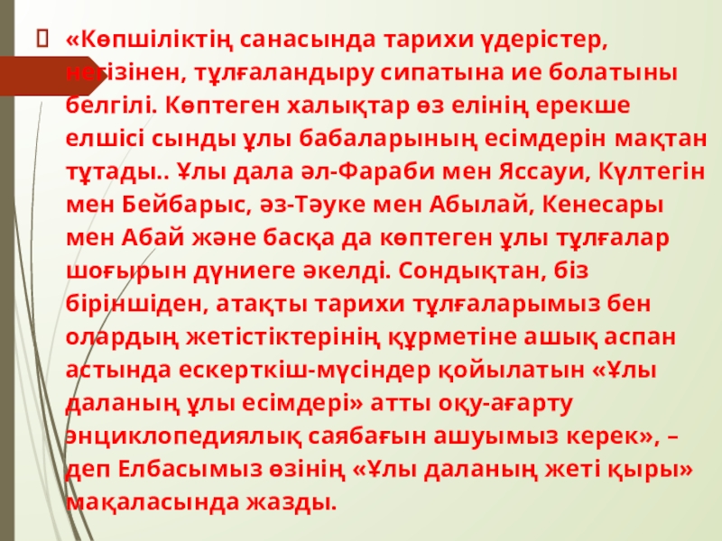 Слайд 6«Көпшіліктің санасында тарихи үдерістер, негізінен, тұлғаландыру сипатына ие болатыны белгілі. Көптеген