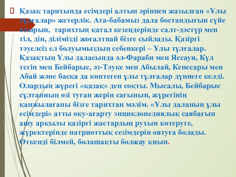 Слайд 7Қазақ тарихында есімдері алтын әріппен жазылған «Ұлы тұлғалар» жетерлік. Ата-бабамыз дала