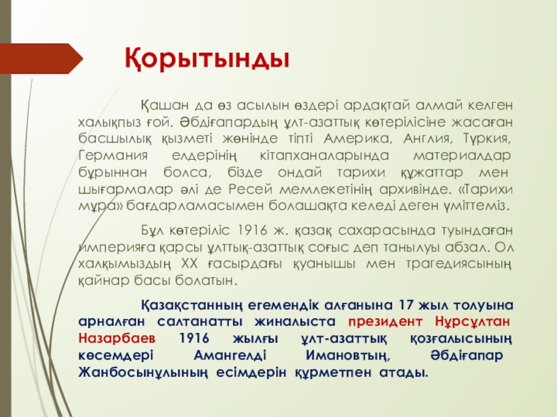 Бұл көтеріліс 1916 ж. қазақ сахарасында туындаған империяға қарсы ұлттық-азаттық соғыс деп танылуы абзал. Ол халқымыздың ХХ ғасырдағы қуанышы мен трагедиясының қайнар басы болатын.