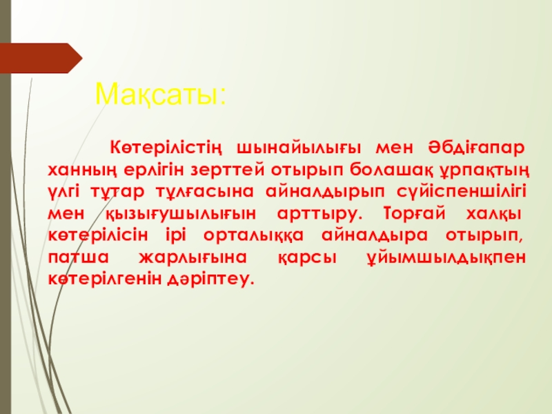 үлгі тұтар тұлғасына айналдырып сүйіспеншілігі мен қызығушылығын арттыру. Торғай халқы көтерілісін ірі орталыққа айналдыра отырып, патша жарлығына қарсы ұйымшылдықпен көтерілгенін дәріптеу.