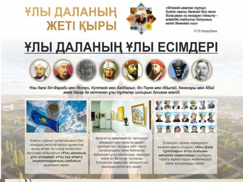 халықтар өз елінің ерекше елшісі сынды ұлы бабаларының есімдерін мақтан тұтады.. Ұлы дала әл-Фараби мен Яссауи, Күлтегін мен Бейбарыс, әз-Тәуке мен Абылай, Кенесары мен Абай және басқа да көптеген ұлы тұлғалар шоғырын дүниеге әкелді. Сондықтан, біз біріншіден, атақты тарихи тұлғаларымыз бен олардың жетістіктерінің құрметіне ашық аспан астында ескерткіш-мүсіндер қойылатын «Ұлы даланың ұлы есімдері» атты оқу-ағарту энциклопедиялық саябағын ашуымыз керек», – деп Елбасымыз өзінің «Ұлы даланың жеті қыры» мақаласында жазды.