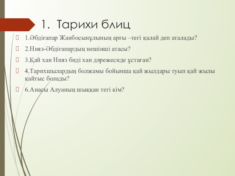 Слайд 211.«Хан»деген атақтың Шыңғыс әулетінен шыққандарға ғана тән дәреже екенін жақсы білетін.