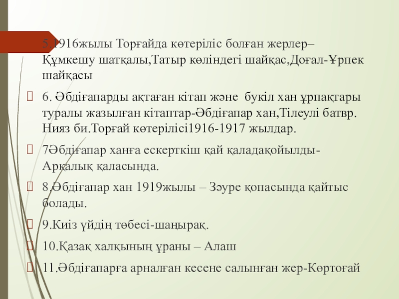 11.Әбдіғапар өмірінің соңына дейін1908ж,1911-1912ж,1914-1915жж қандай нәрселерді жүзеге асырды?(Болыс болды.Ақбидайық кедейлерінен егістік жерлерін алып берді.)