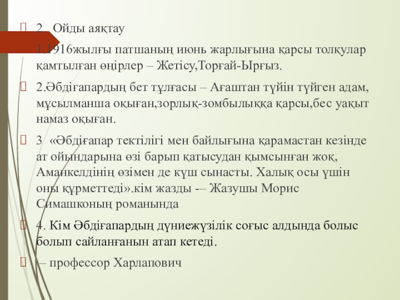 2.Әбдіғапардың бет тұлғасы – Ағаштан түйін түйген адам,мұсылманша оқыған,зорлық-зомбылыққа қарсы,бес уақыт намаз оқыған.