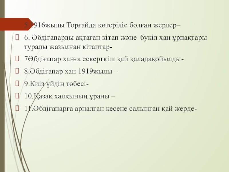 Слайд 165.1916жылы Торғайда көтеріліс болған жерлер–