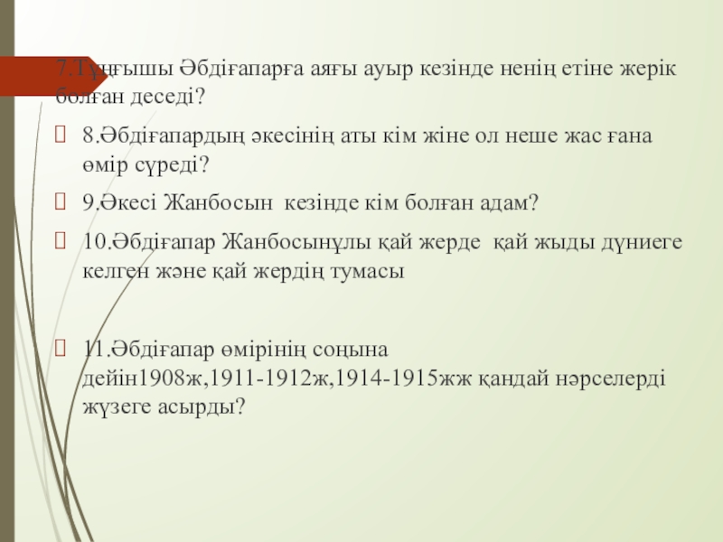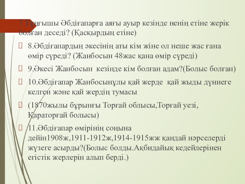 8.Әбдіғапардың әкесінің аты кім жіне ол неше жас ғана өмір сүреді? (Жанбосын 48жас қана өмір сүреді)