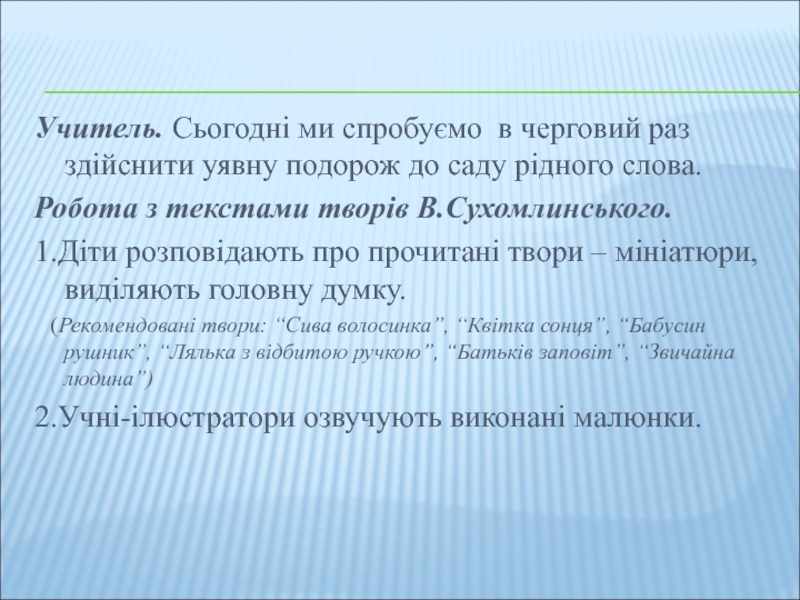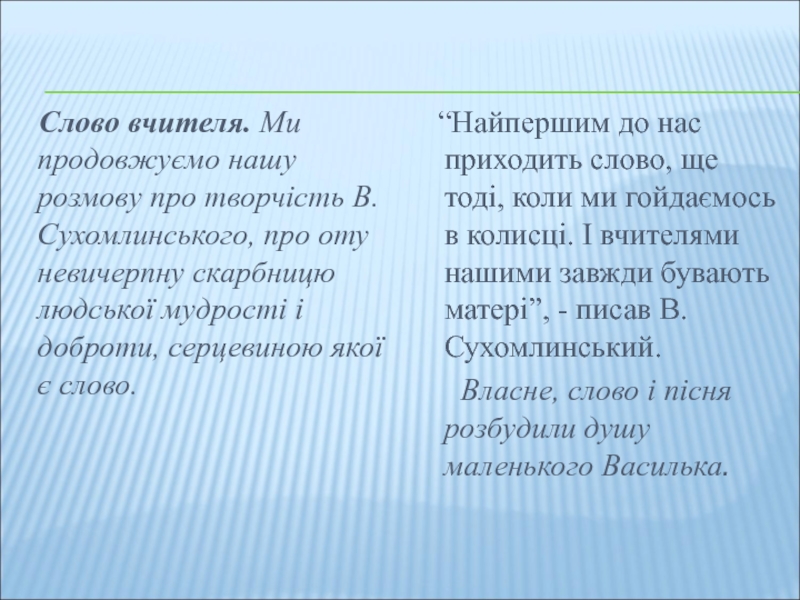 Слово вчителя. Ми продовжуємо нашу розмову про творчість В.Сухомлинського,