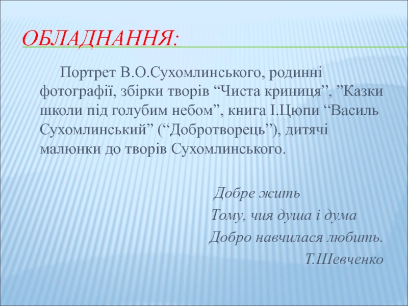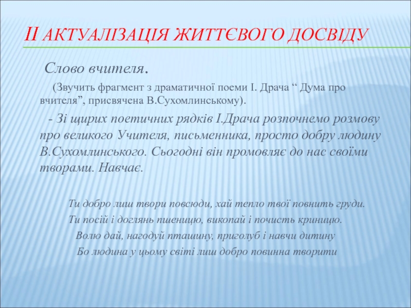 - Зі щирих поетичних рядків І.Драча розпочнемо розмову про великого Учителя, письменника, просто добру людину В.Сухомлинського. Сьогодні він промовляє до нас своїми творами. Навчає.