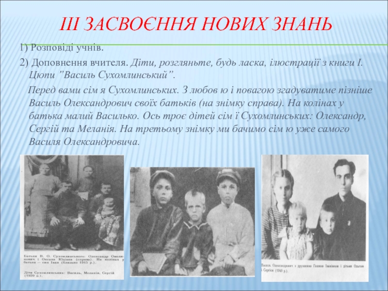 Перед вами сім я Сухомлинських. З любов ю і повагою згадуватиме пізніше Василь Олександрович своїх батьків (на знімку справа). На колінах у батька малий Василько. Ось троє дітей сім ї Сухомлинських: Олександр, Сергій та Меланія. На третьому знімку ми бачимо сім ю уже самого Василя Олександровича.