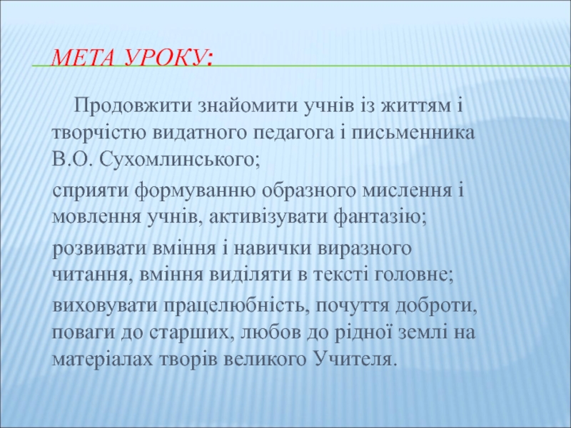 Продовжити знайомити учнів із життям і творчістю видатного педагога і письменника В.О. Сухомлинського;