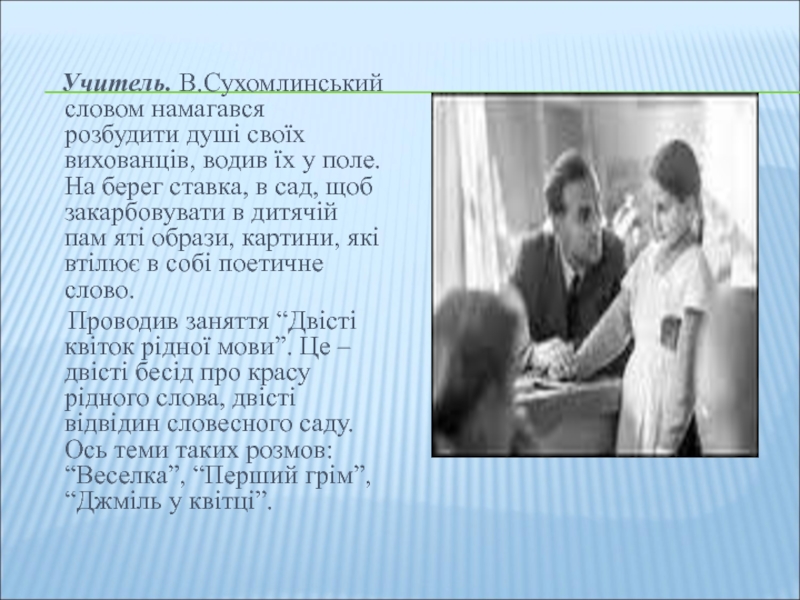 Учитель. В.Сухомлинський словом намагався розбудити душі своїх вихованців, водив