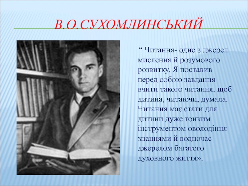 “ Читання- одне з джерел мислення й розумового розвитку. Я поставив перед собою завдання вчити такого читання, щоб дитина, читаючи, думала. Читання має стати для дитини дуже тонким інструментом оволодіння знаннями й водночас джерелом багатого духовного життя».