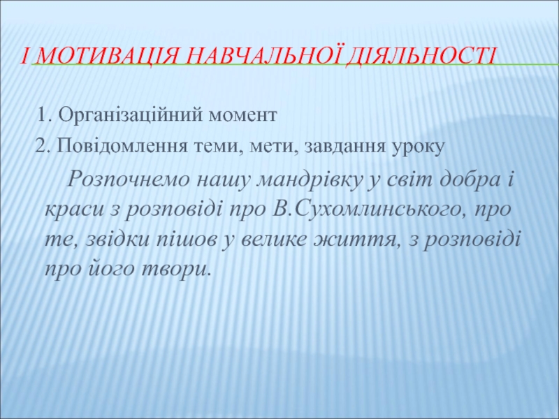 Розпочнемо нашу мандрівку у світ добра і краси з розповіді про В.Сухомлинського, про те, звідки пішов у велике життя, з розповіді про його твори.