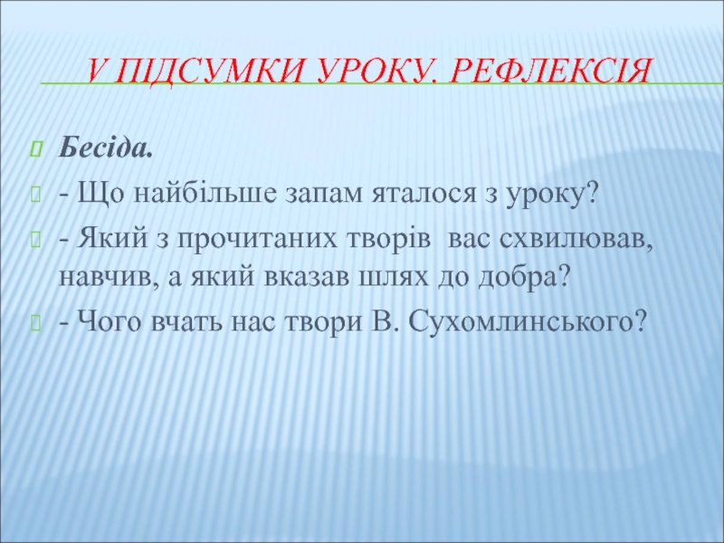 Слайд 14V ПІДСУМКИ УРОКУ. РЕФЛЕКСІЯ
