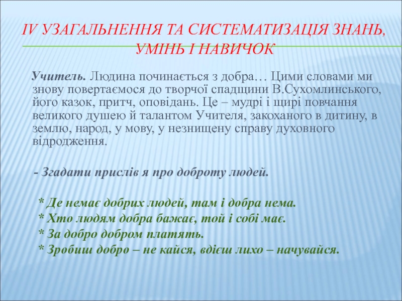 Слайд 13ІV УЗАГАЛЬНЕННЯ ТА СИСТЕМАТИЗАЦІЯ ЗНАНЬ, УМІНЬ І НАВИЧОК