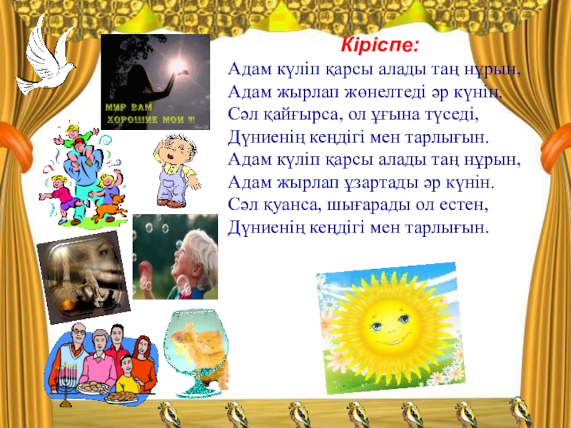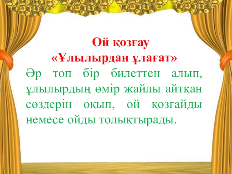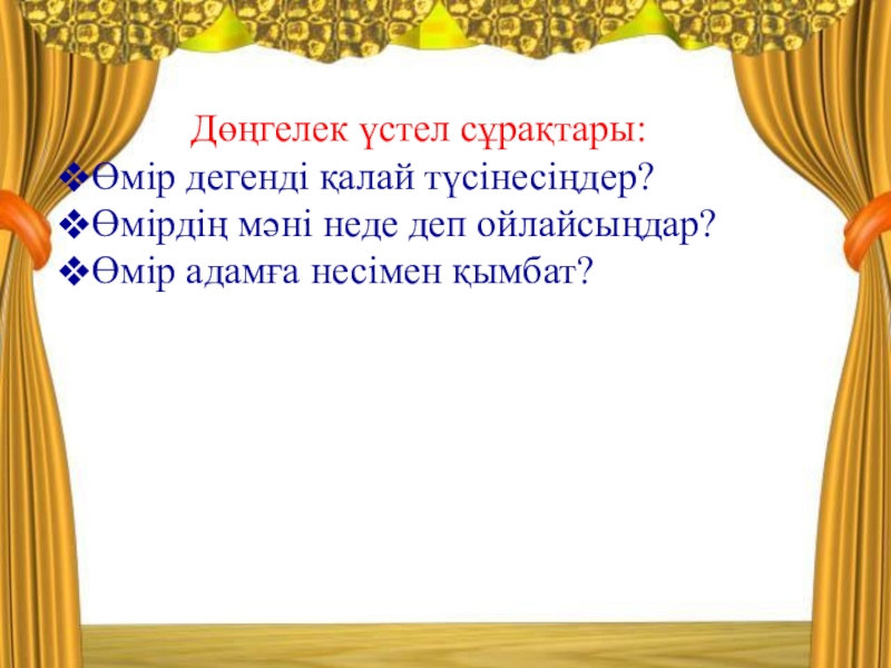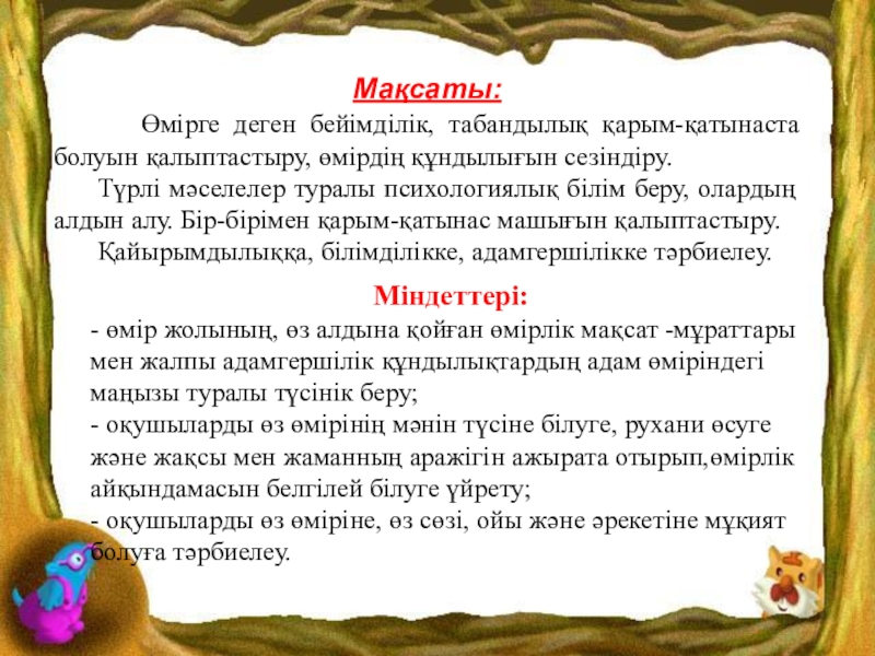 - оқушыларды өз өмірінің мәнін түсіне білуге, рухани өсуге және жақсы мен жаманның аражігін ажырата отырып,өмірлік айқындамасын белгілей білуге үйрету;
