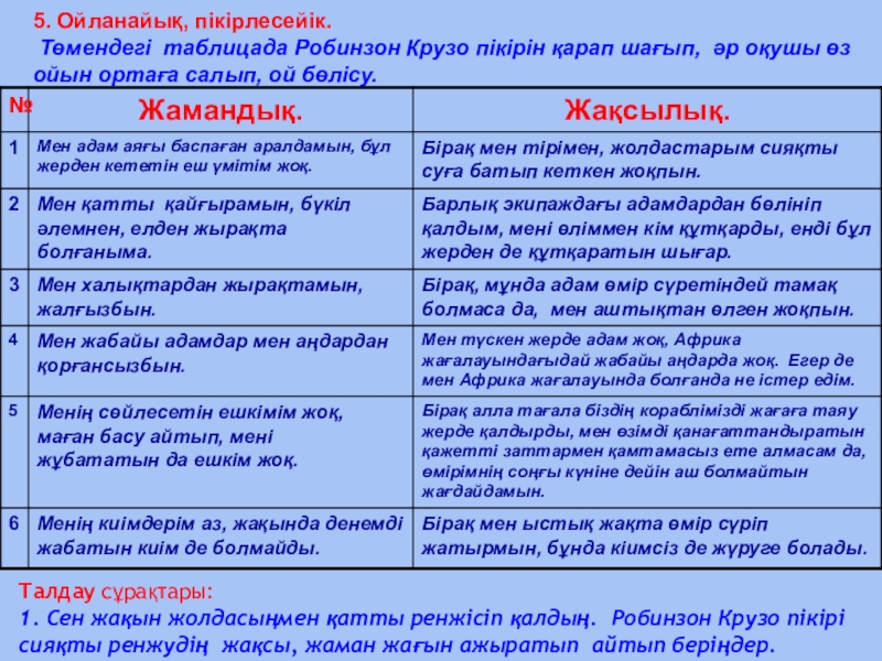 1. Сен жақын жолдасыңмен қатты ренжісіп қалдың. Робинзон Крузо пікірі сияқты ренжудің жақсы, жаман жағын ажыратып айтып беріңдер.