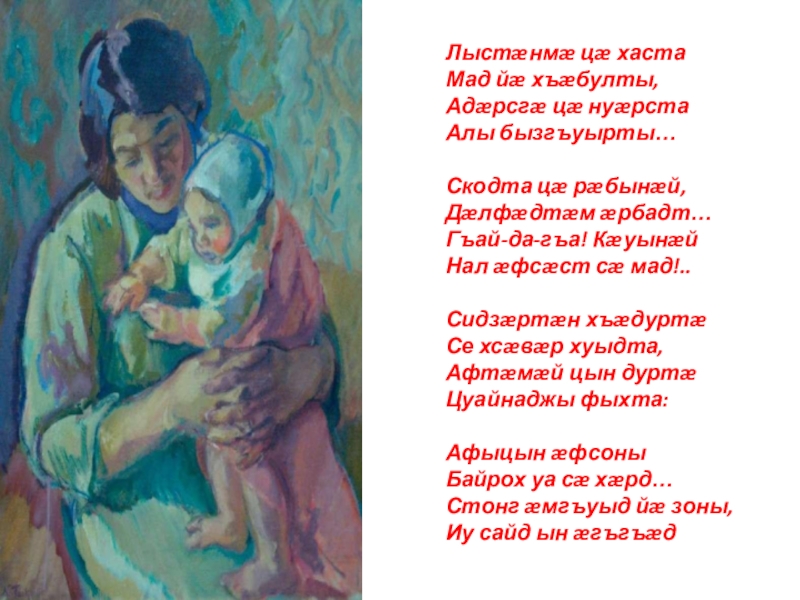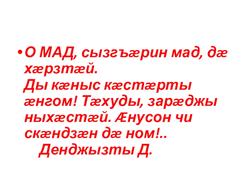 О МАД, сызгъæрин мад, дæ хæрзтæй. Ды кæныс кæстæрты æнгом! Тæхуды, зарæджы ныхæстæй. Æнусон чи скæндзæн дæ ном!..