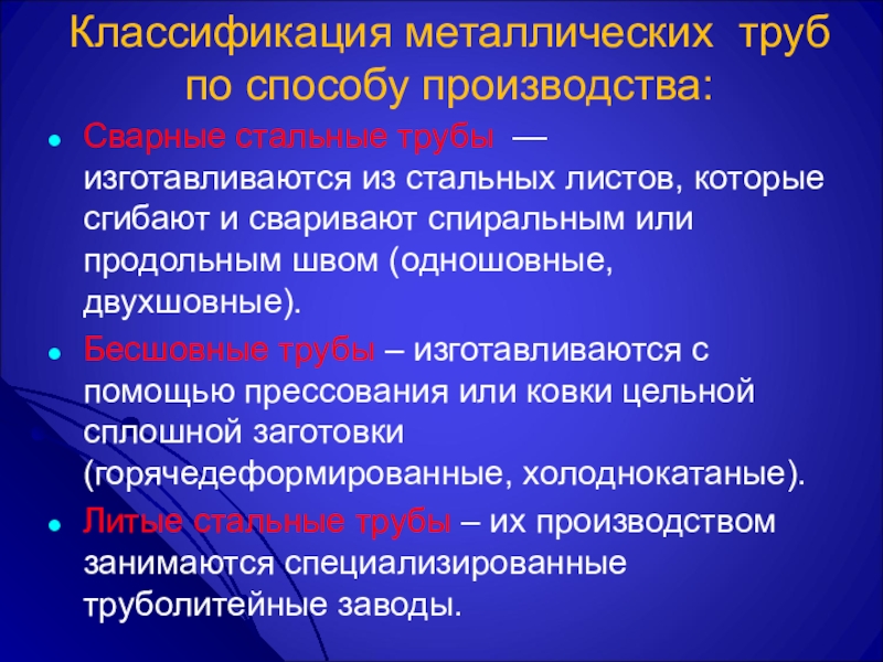 Бесшовные трубы – изготавливаются с помощью прессования или ковки цельной сплошной заготовки (горячедеформированные, холоднокатаные).