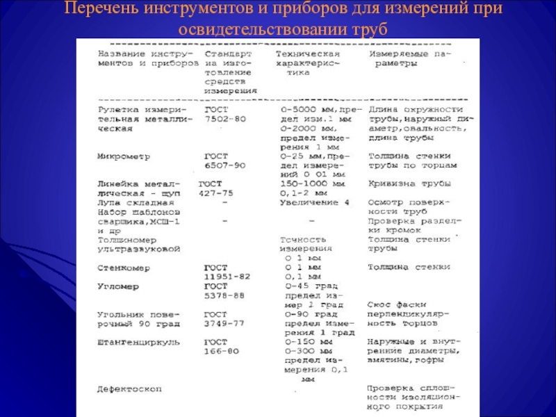 Слайд 42Перечень инструментов и приборов для измерений при освидетельствовании труб